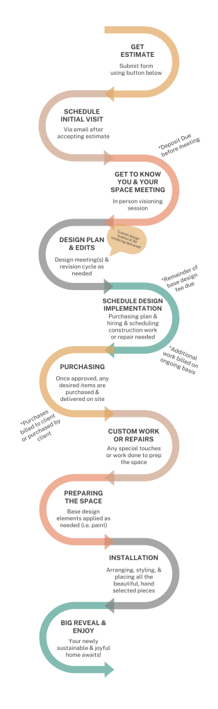 *Note, this work flows are not meant to be exact–nor provide timeline estimates–but to give you a rough idea of how we work. Due to each person’s unique space and needs, our processes may be tweaked as EcoInteriors’s discretion.